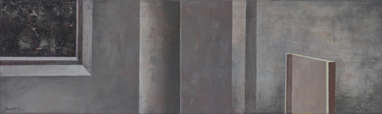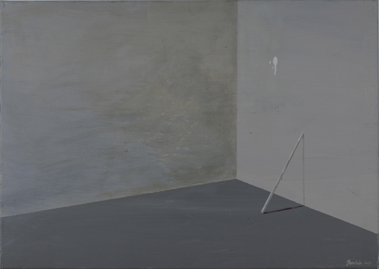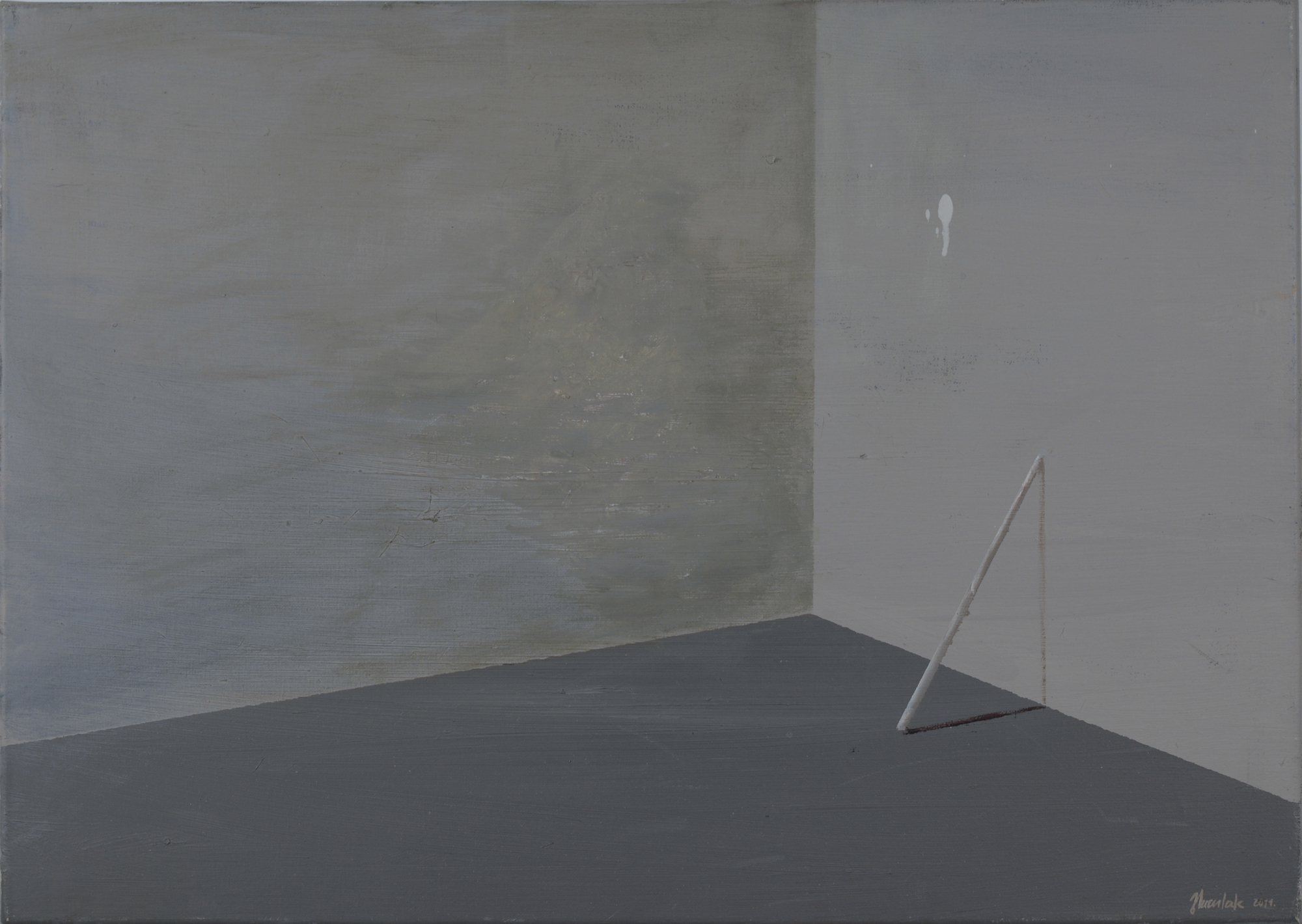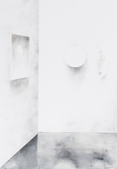 Monochromatic Hypostases are minimalist representations of tightly cropped elements of interiors, ceilings and walls. Contrary to Hypotheses, they have a specific prototype: a photography that documents a fraction of reality. As far as the visual aspects are concerned, these fractions are in fact naturally abstract, what makes it possible to consider the paintings as a tangible sign of an idea. The effect of idealisation, of the blurring of the boundaries between the physical and mental, is emphasized by scale, composition and the preservation of the picture's visual character on the border of visibility. Although every time the motif is real, thanks to the use of reduction the effect remains relatively abstract, difficult to define and thus also hypothetical. The fact that it is impossible to clearly classify the paintings results in their suspension between reality and the mental construct and situates them in a specific area of the phenomenological epoché, making solid reality barely a subjective and uncertain conjecture.