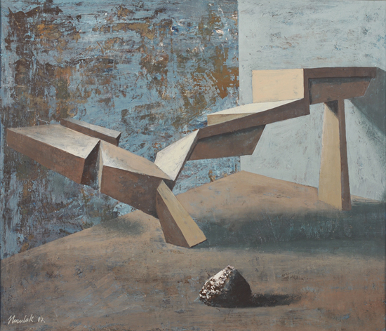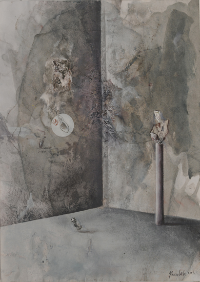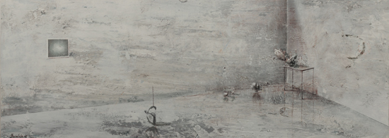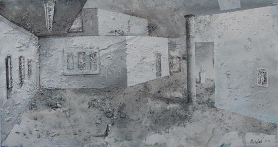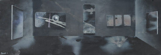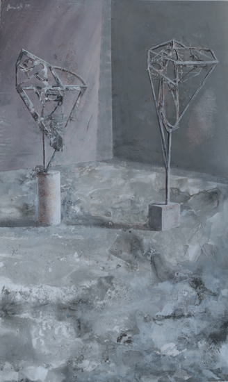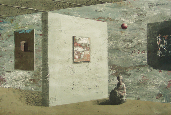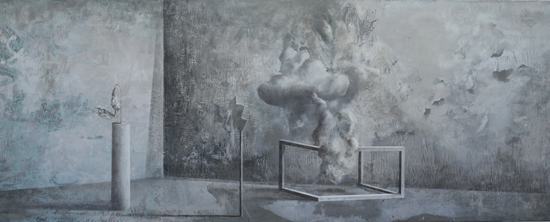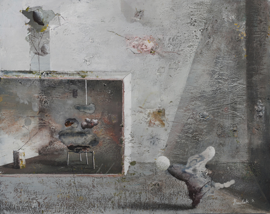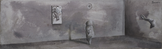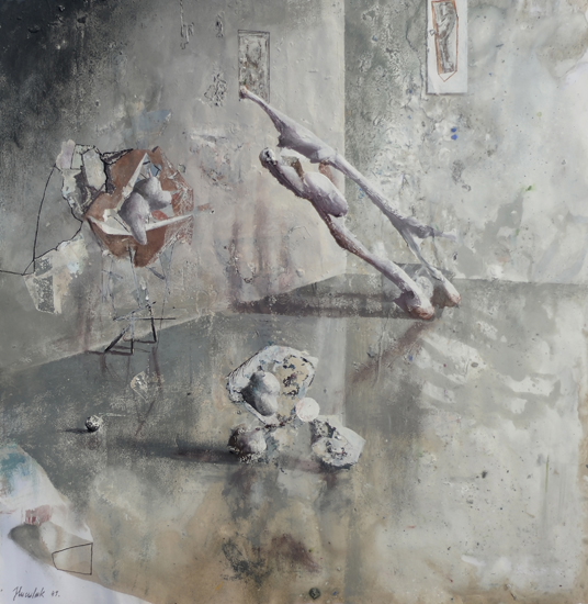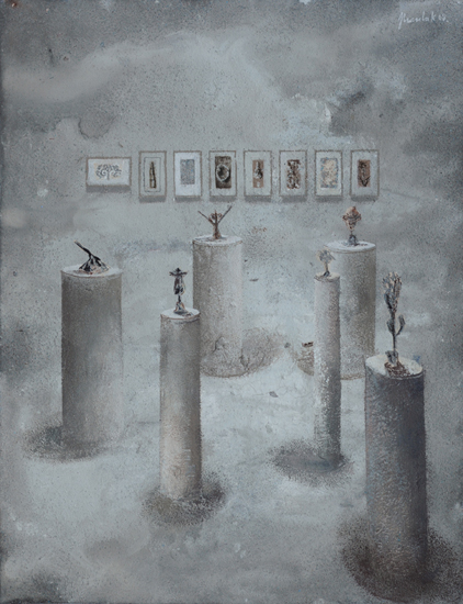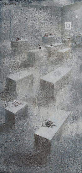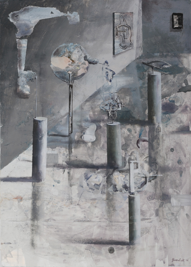 The PIP is not so much the idea of painting a picture as the idea of painting inside the picture. This is not the picture present but before or after – a type of an exhibition project (an arrangement proposal) or documentation after the show. The closest example of a similar concept can be found in the paintings serving as catalogues of art collections, which the European rulers used to send each other in the eighteenth century. Other possible associations are church interiors of Dutch perspektiveschilders, affected by an abstract sense of Protestant iconoclasm. In both cases, the pictures were predominantly utilitarian – they served as the means of documentation or registration. My paintings retain their aesthetic autonomy. I paint objects that are fictional. Having been created by accident, they can not copy. In my opinion much of the painter work is the careful observation of what is happening with the paint – and so with the whole picture – beyond our control. What visual effects are generated spontaneously by the paintbrush and paint themselves? I evoke potential objects, devoid of clear authorship and provenance, by capturing these effects and introducing them into the structure of representation. Everyone, however, can see in these objects an unknown work or an abandoned project of other artist. They can also be inanimate parts of nature. The problem of authorship is discussed here on a few levels.