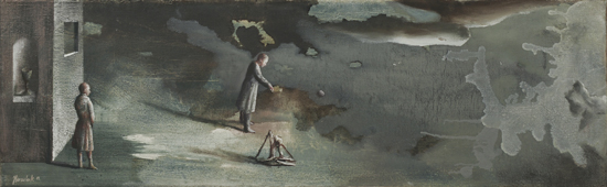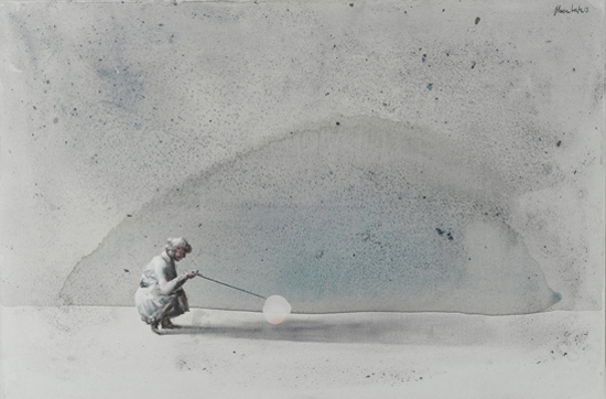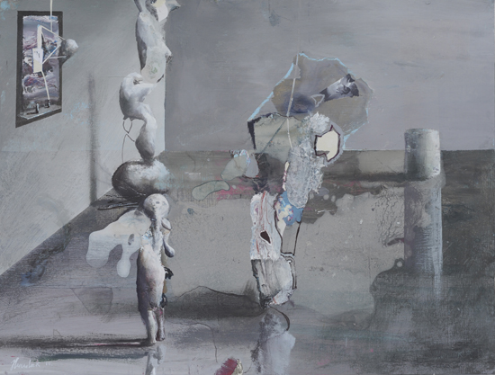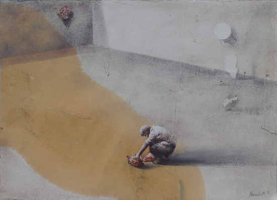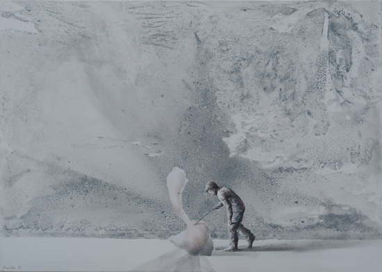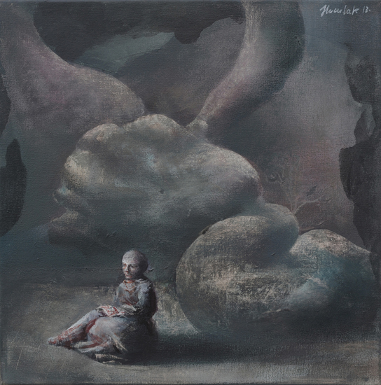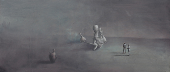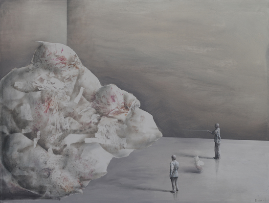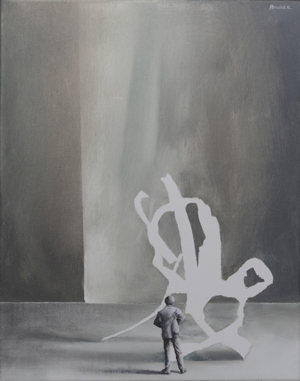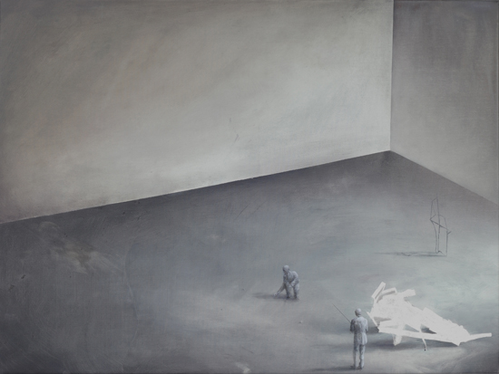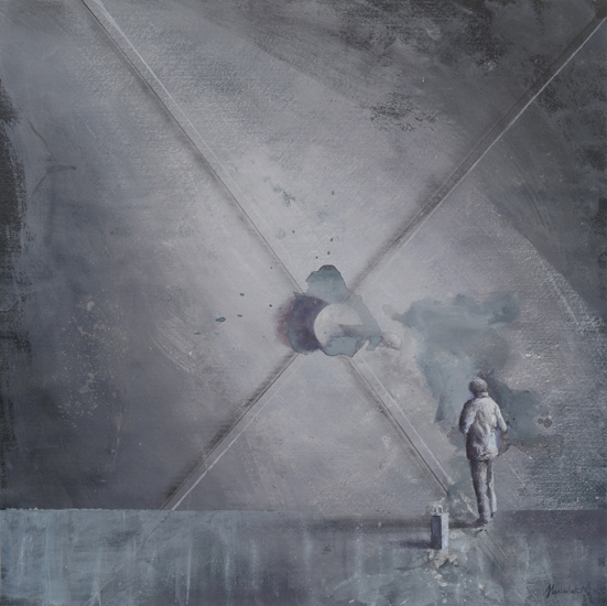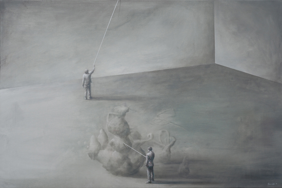 The Experiment is an attempt to merge painting effects obtained in The Hypotheses cycle with a formula of a figurative scene. It indicates an interest in by-products of research processes, such as misguided assumptions and outdated claims, which after time become only an anachronistic superstition. Aimed at the understanding and control of the reality through the exploration of the governing laws, science in a way tries to expand the boundaries of our independence. What are still our limits? How and why are we limited? What can we do to free ourselves from this limitation? What will happen if we are finally able to decide about everything?