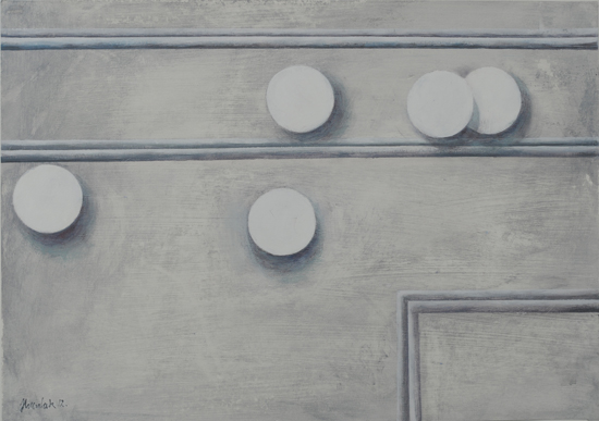Malowane w zawężonej i stonowanej gamie Hipostazy przedstawiają wąsko wykadrowane fragmenty wnętrz, sufitów i ścian. W przeciwieństwie do Hipotez posiadają konkretny pierwowzór: fotograficznie zdokumentowany, realnie istniejący fragment świata. Pod względem wizualnym fragmenty te są właściwie „naturalnie” abstrakcyjne, co pozwala obrazy traktować jako materialny, „namacalny” objaw abstrakcji. Efekt idealizacji, zatarcia granic pomiędzy fizycznym i mentalnym, dokonuje się dodatkowo za pomocą skali i kompozycji, oraz utrzymania wizualnego charakteru przedstawienia na pograniczu widzialności. Mimo że motyw za każdym razem jest realny, dzięki zastosowanej redukcji efekt pozostaje względnie abstrakcyjny, trudny do zdefiniowania, płynny interpretacyjnie, a więc również hipotetyczny. Niemożność jednoznacznego sklasyfikowania wprowadza obrazy w stan zawieszenia pomiędzy rzeczywistością i konstruktem umysłowym, sytuuje w obszarze swoistego fenomenologicznego epochē, czyniąc namacalną rzeczywistość subiektywnym i niepewnym domysłem.