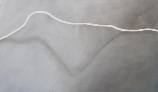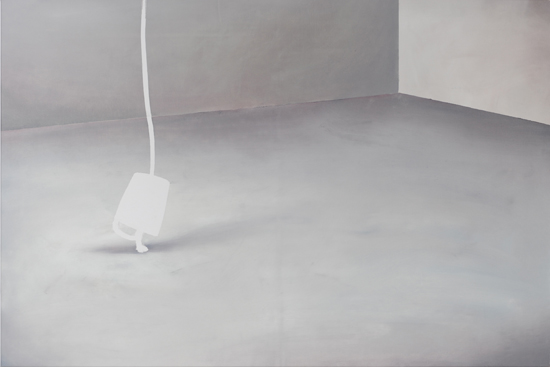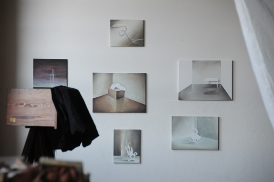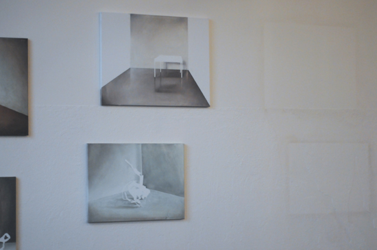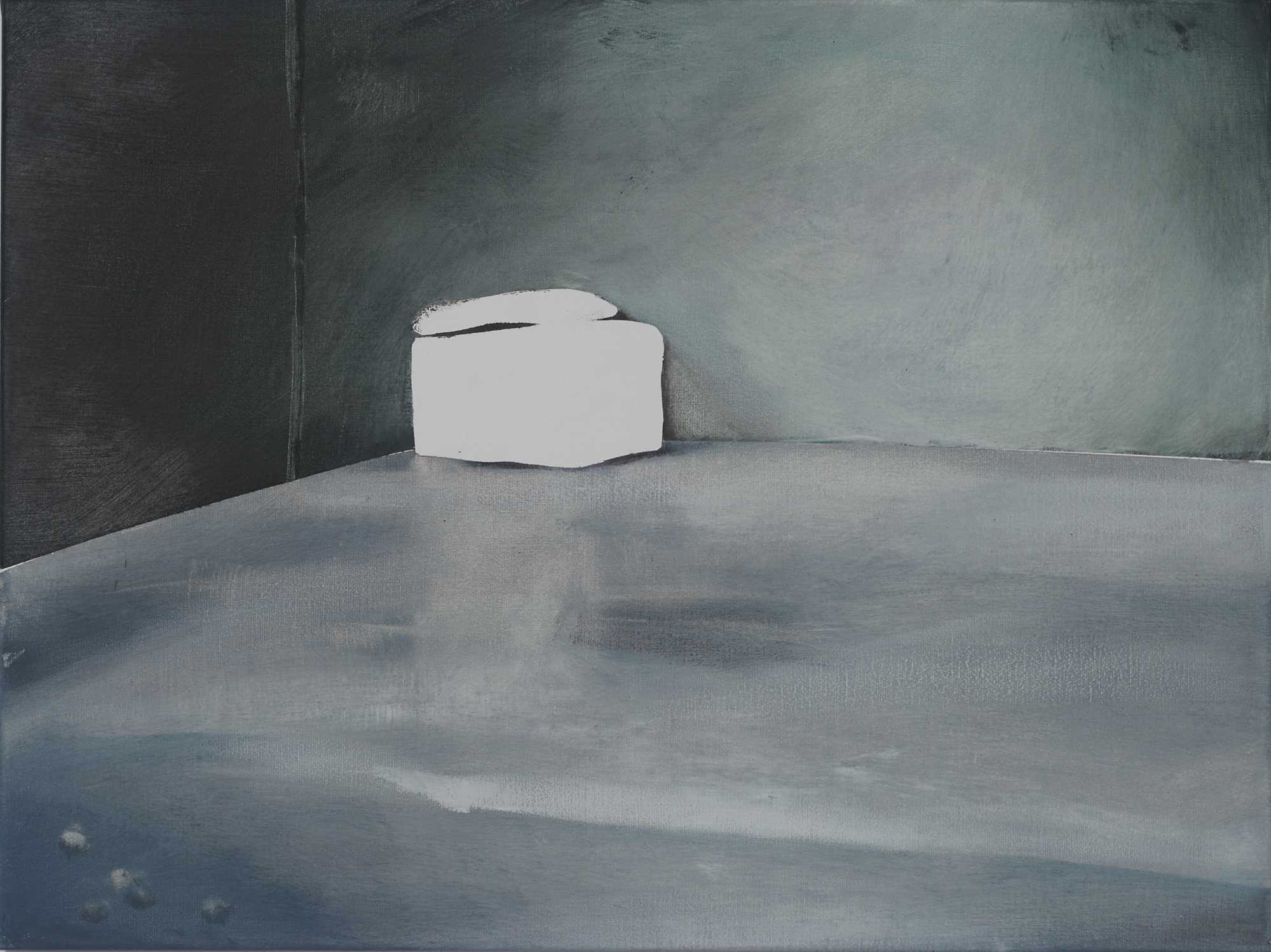 Miejsce po… przedstawia samo miejsce - przestrzeń - bez rzeczy, dziurę po nich. Jest próbą apofatycznego opowiadania o istnieniu poprzez brak, odwołaniem do słów Brodskiego: rzecz to przestrzeń, poza którą tej rzeczy brak, oraz japońskiej koncepcji Ma, in between, tego co „pomiędzy”. Gram relacją figura-tło: figura ulega redukcji pozostawiając samotne tło, a białe sylwety pustych miejsc „po rzeczach” ujawniają swój realistyczny potencjał. Zazwyczaj malując rzeczy drugi plan traktuję jako uzupełnienie, ekran. Teraz odwracam relację: nie maluję już rzeczy, ale ich miejsce, miejsce po…